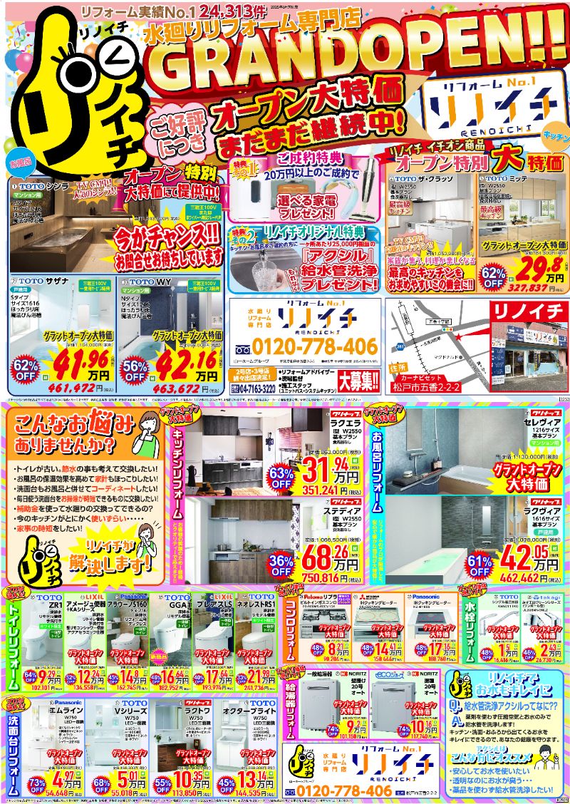 ”山一ホーム 水廻りリフォームフェア”開催中!! 及び “リノイチ 松戸店 グランドオープン”しました。