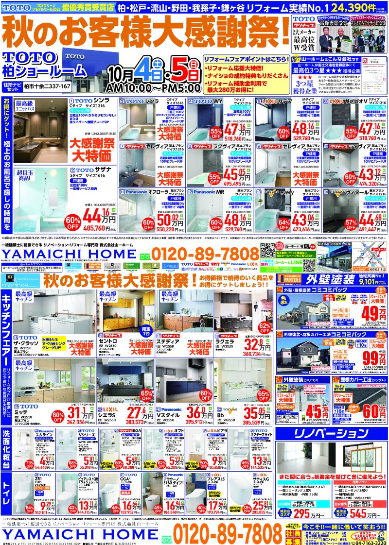 山一ホーム 水廻り専門店”マリンズ”・ 外壁塗装・屋根事業部”ペインターズ”主催”秋のお客様大感謝祭”を、同時開催いたします。