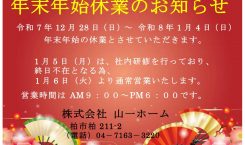 ホーム > 2025年 > 12月 2025.12.26 EVENTMARINESBATONPROPERTYS 年末年始 休業のお知らせ 山一ホームでございます。 12/28日曜日より1/4日曜日まで年末年始休業とさせていただきます。 1/5月曜日は、社内研修をおこなっており、終日不在となる為、1/6火曜日より通常営業となりますので宜しくお願い致します。 年末年始2025 メールでのご相談はこちら next prev サムネイル 本社 〒277-0005 千葉県柏市柏211-2 TEL:04-7163-3220 FAX:04-7163-3221 サムネイル 工事管理センター 〒277-0813 千葉県柏市大室1208-32 TEL:04-7134-7839 FAX:04-7136-8378